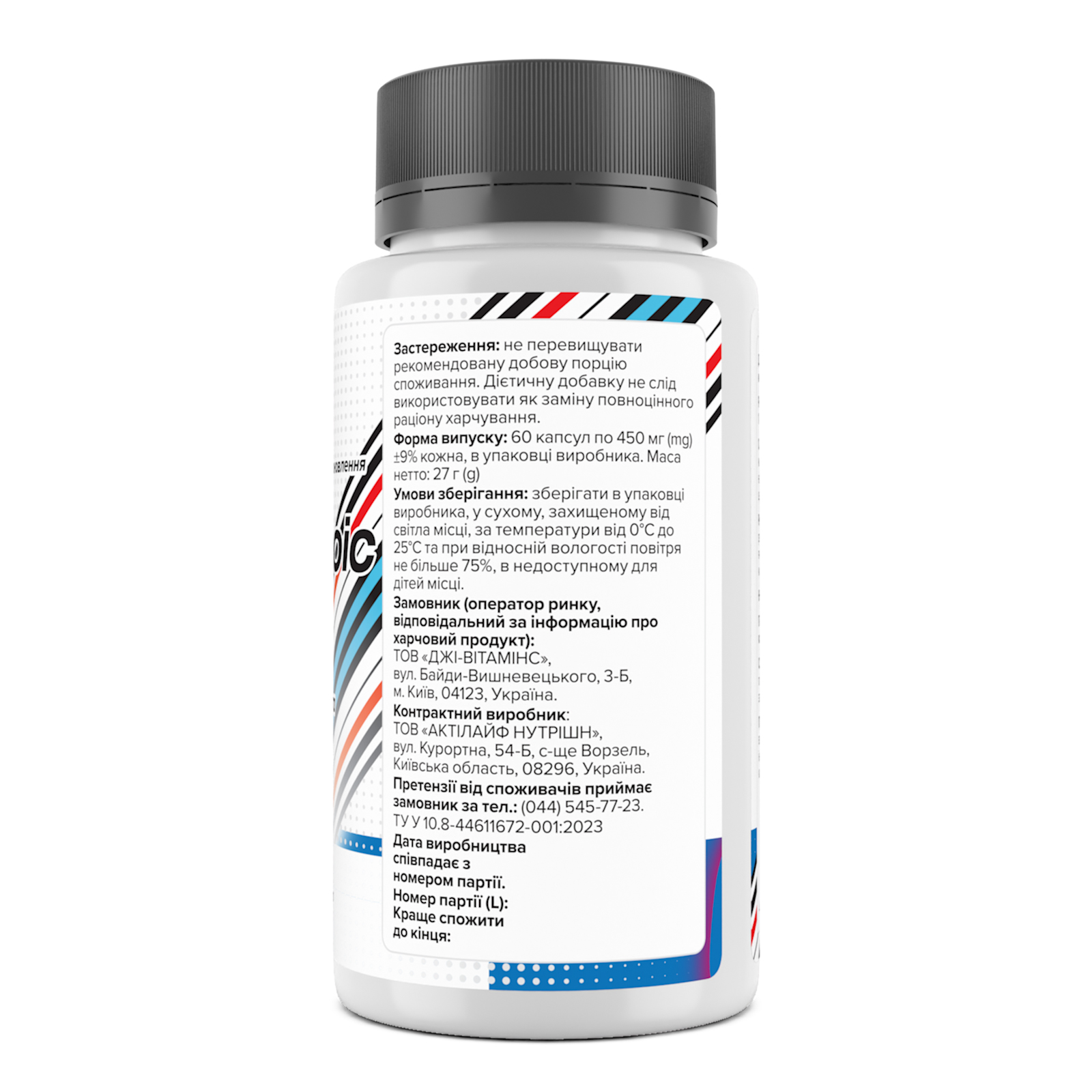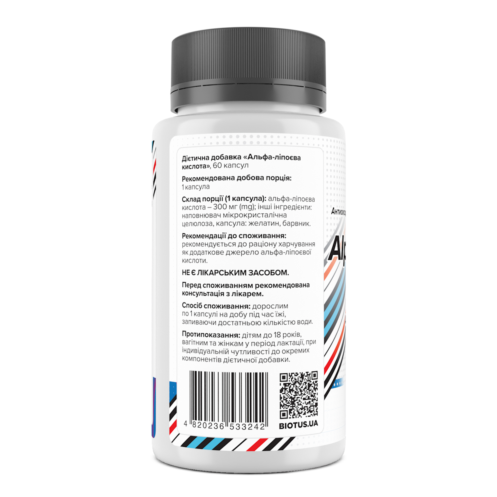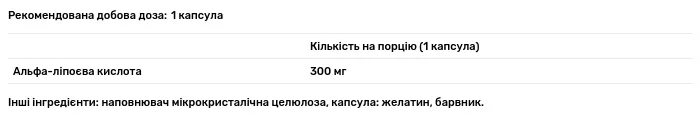 Склад порції: альфа-ліпоєва кислота – 300 мг (mg); інші інгредієнти: наповнювач мікрокристалічна целюлоза, капсула: желатин, барвник.