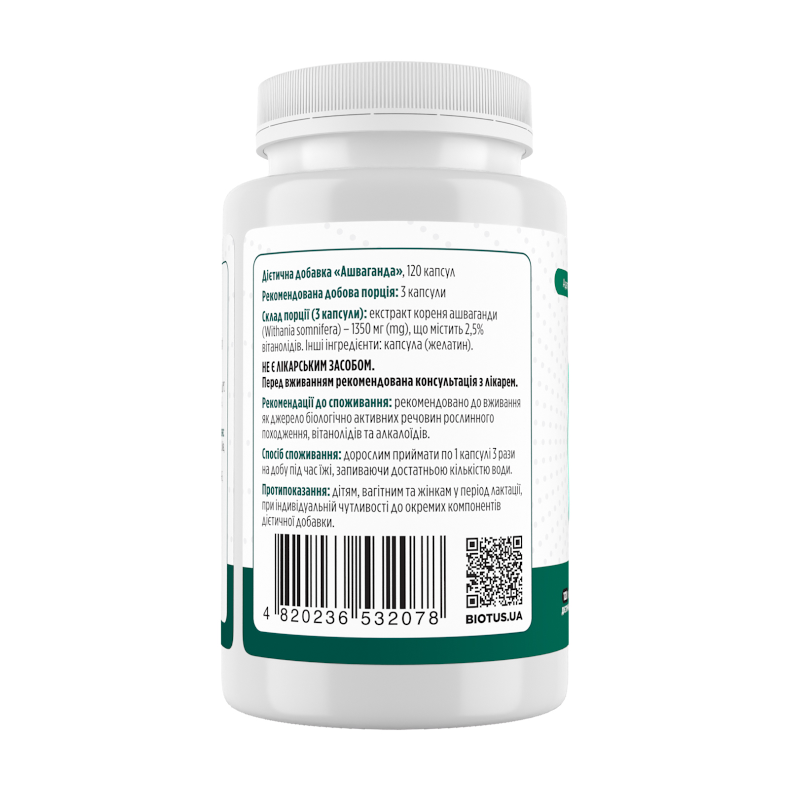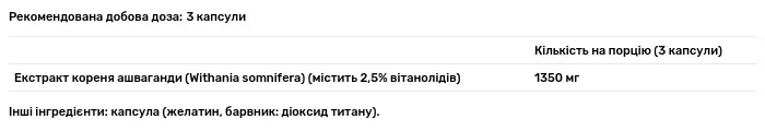 Склад порції: екстракт кореня ашваганди (Withania somnifera) – 1350 мг (mg), що містить 2,5% вітанолідів. Інші інгредієнти: капсула (желатин).