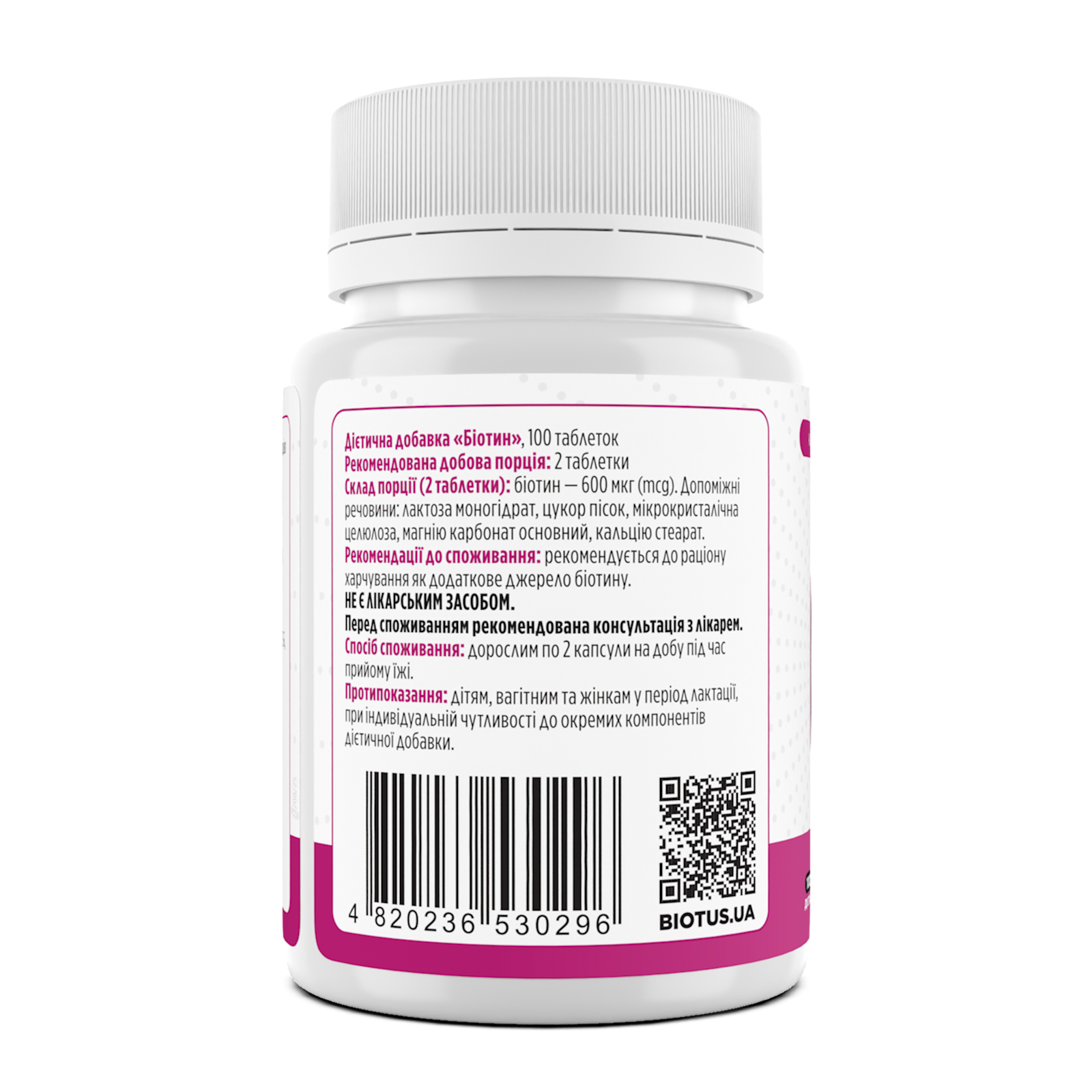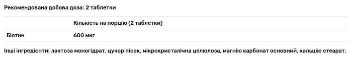 Склад порції: біотин – 600 мкг (mcg). Допоміжні речовини: лактоза моногідрат, цукор пісок, мікрокристалічна целюлоза, магнію карбонат основний, кальцію стеарат.