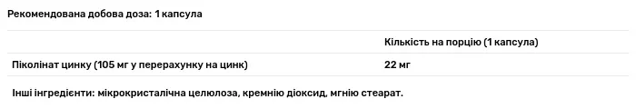 Склад порції: піколінат цинку – 105 мг (mg) (в перерахунку на цинк – 22 мг (mg)). Допоміжні речовини: мікроцелюлоза, кремнія діоксид, магнія стеарат.