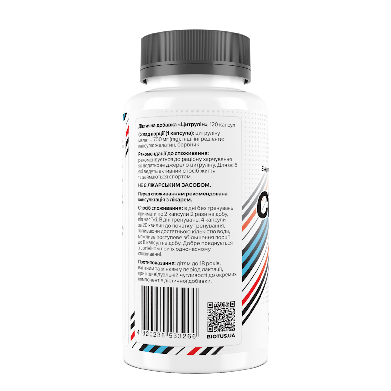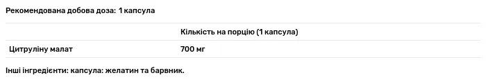 Склад порції: цитруліну малат – 700 мг (mg). Допоміжні речовини: капсула: желатин, барвник.