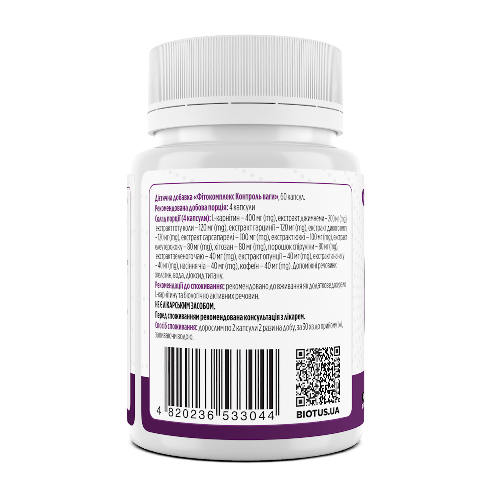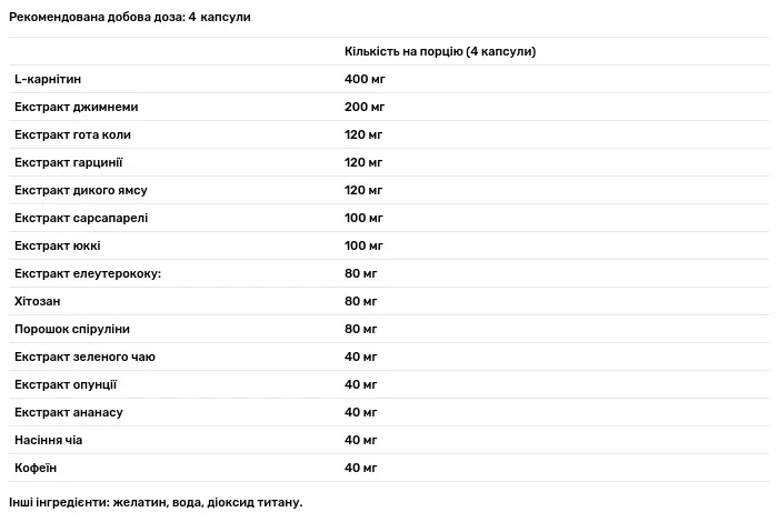 Склад порції: L-карнітин – 400 мг (mg), екстракт джимнеми – 200 мг (mg), екстракт готу коли – 120 мг (mg), екстракт гарцинії – 120 мг (mg), екстракт дикого ямсу – 120 мг (mg), екстракт сарсапарелі – 100 мг (mg), екстракт юккі – 100 мг (mg), екстракт елеутерококу – 80 мг (mg), хітозан – 80 мг (mg), порошок спіруліни – 80 мг (mg), екстракт зеленого чаю – 40 мг (mg), екстракт опунції – 40 мг (mg), екстракт ананасу – 40 мг (mg), насіння чіа – 40 мг (mg), кофеїн – 40 мг (mg). Допоміжні речовини: желатин, вода, діоксид титану.