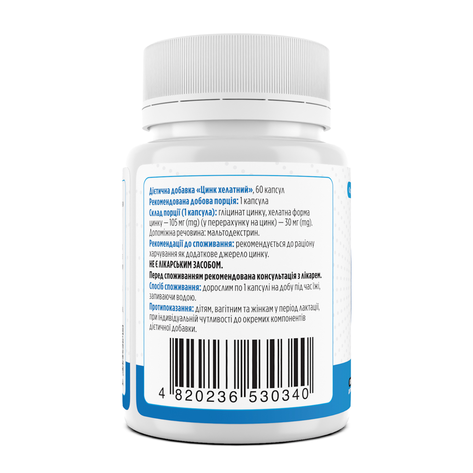 Склад порції: гліцинат цинку, хелатна форма цинку — 105 мг (mg) (у перерахунку на цинк) — 30 мг (mg). Допоміжна речовина: мальтодекстрин.