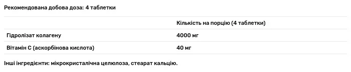 Склад порції: гідролізат колагену – 4000 мг (mg), вітамін С (аскорбінова кислота) – 40 мг (mg). Допоміжні речовини: мікрокристалічна целюлоза, кальцію стеарат.