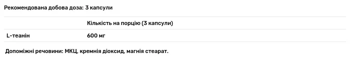 Склад порції: L-теанін — 600 мг (mg). Допоміжні речовини: МКЦ, кремнія діоксид, магнія стеарат.