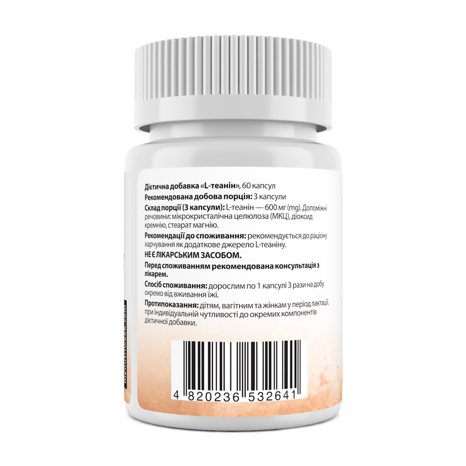 Склад порції: L-теанін — 600 мг (mg). Допоміжні речовини: МКЦ, кремнія діоксид, магнія стеарат.