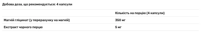 Склад порції: магній гліцинат (в перерахунку на магній) — 350 мг (mg), екстракт чорного перцю — 5 мг (mg). Допоміжні речовини: МКЦ, магнію стеарат, кремнія діоксид.