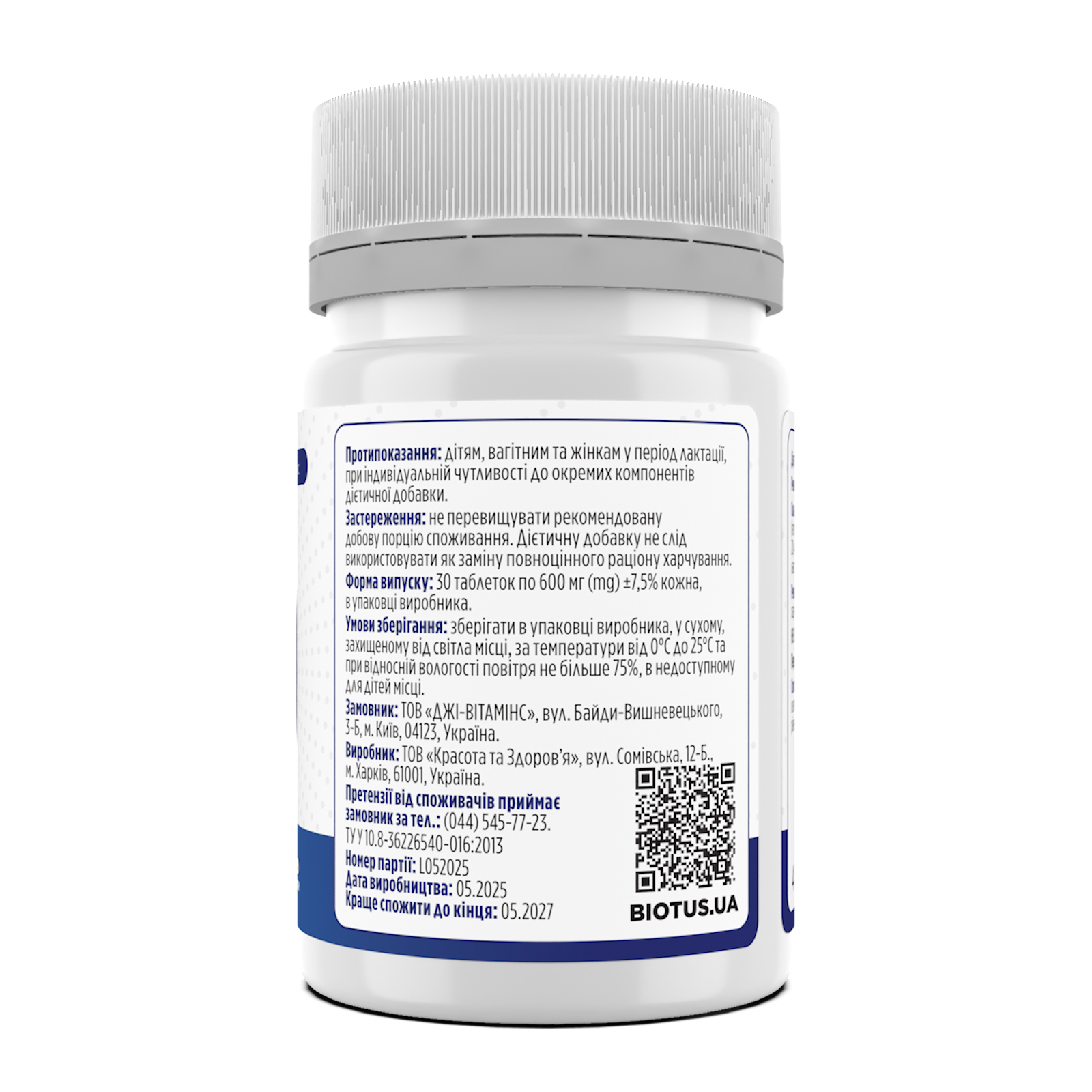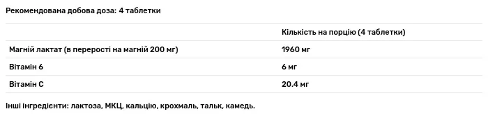 Склад порції: магнію лактат — 1960 мг (mg) (в перерахунку на магній) — 200 мг (mg), вітамін С — 20,4 мг (mg), вітамін В6 — 6 мг (mg). Допоміжні речовини: лактоза, МКЦ, кальцію стеарат, крохмаль, тальк, камедь.