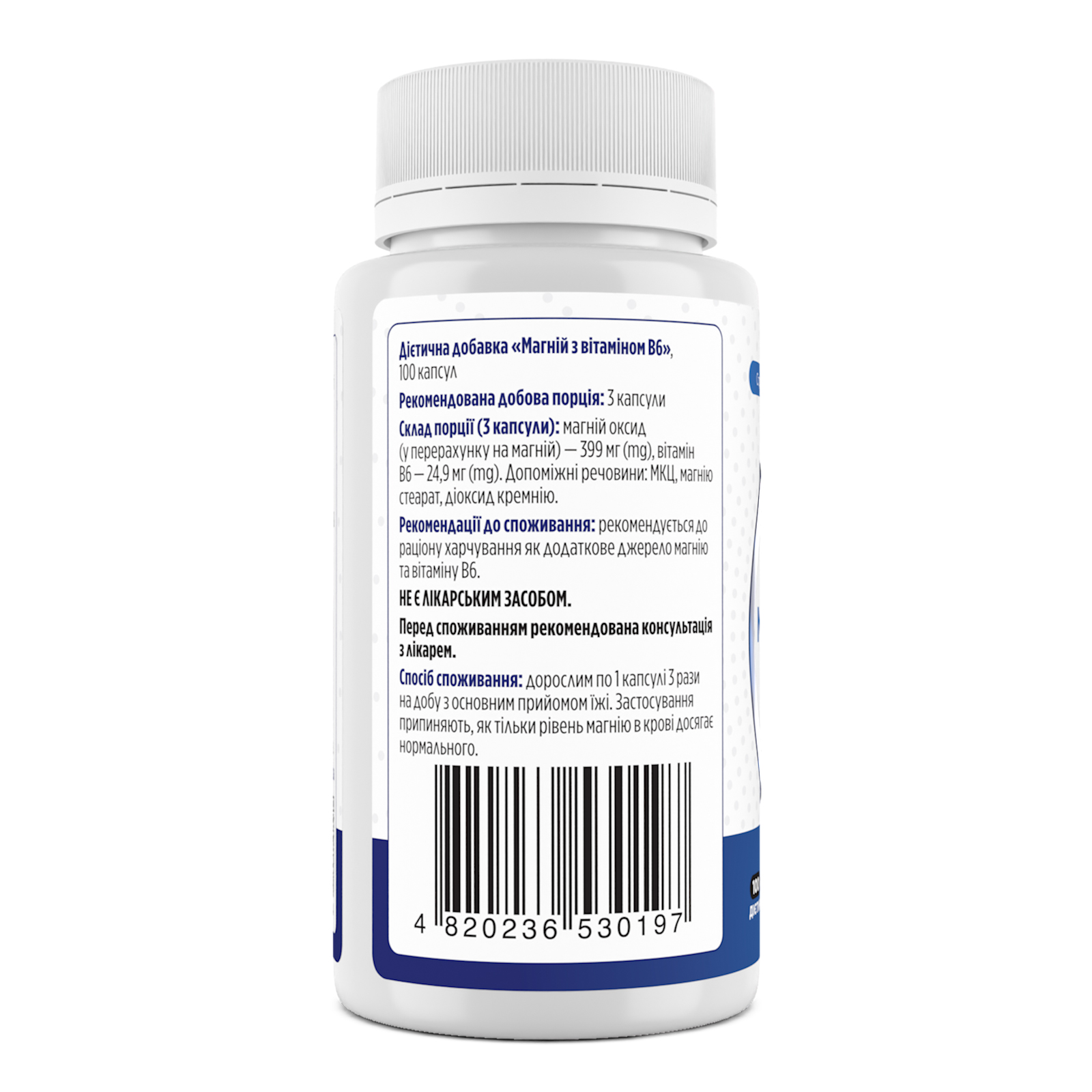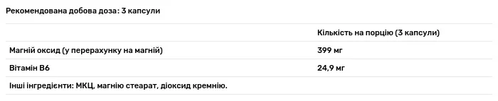 Склад порції: магній оксид (у перерахунку на магній) — 399 мг (mg), вітамін В6 — 24,9 мг (mg). Допоміжні речовини: МКЦ, магнію стеарат, діоксид кремнію.