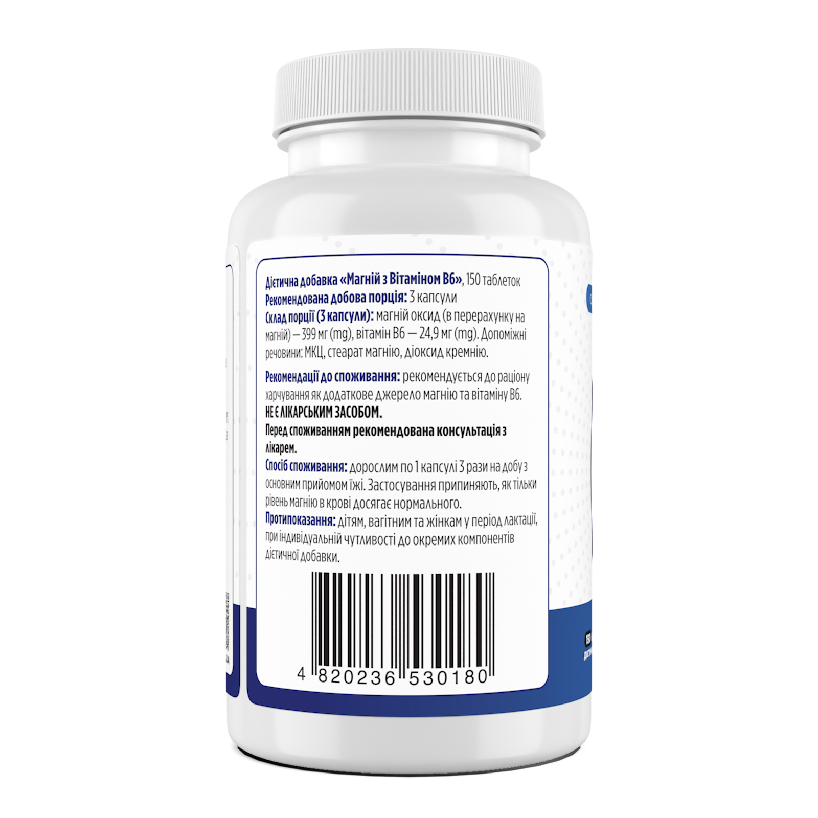 Склад порції: магній оксид (у перерахунку на магній) — 399 мг (mg), вітамін В6 — 24,9 мг (mg). Допоміжні речовини: МКЦ, магнію стеарат, діоксид кремнію.