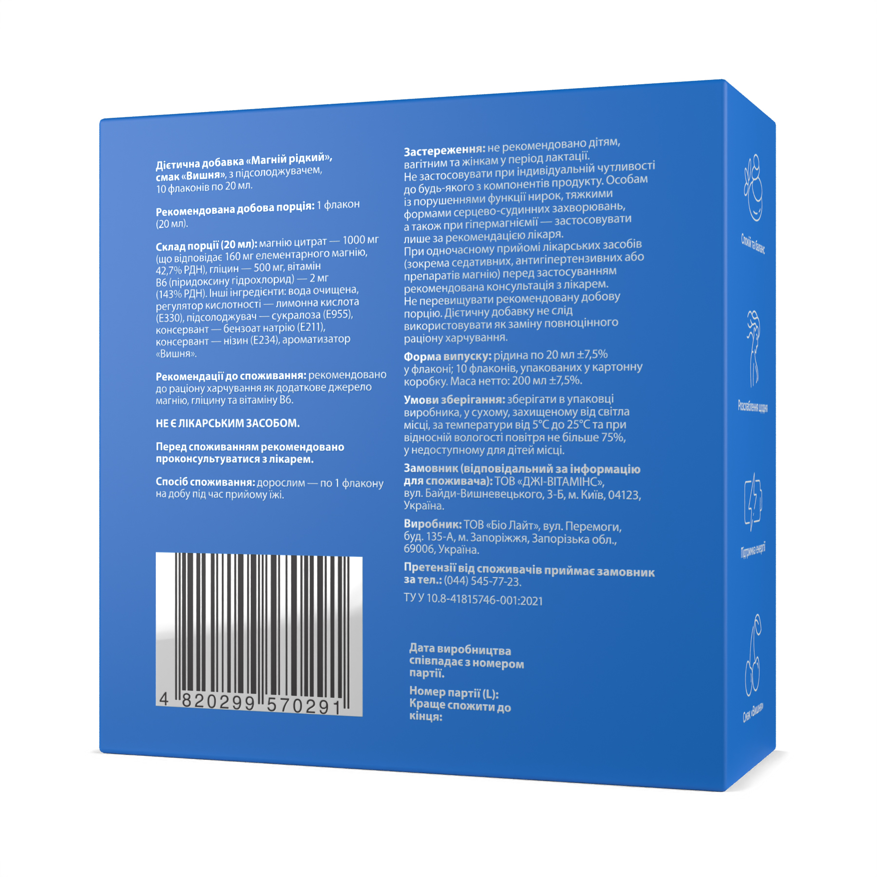Магній рідкий, смак “Вишня”, з підсолоджувачем, 14 флаконів по 20 мл