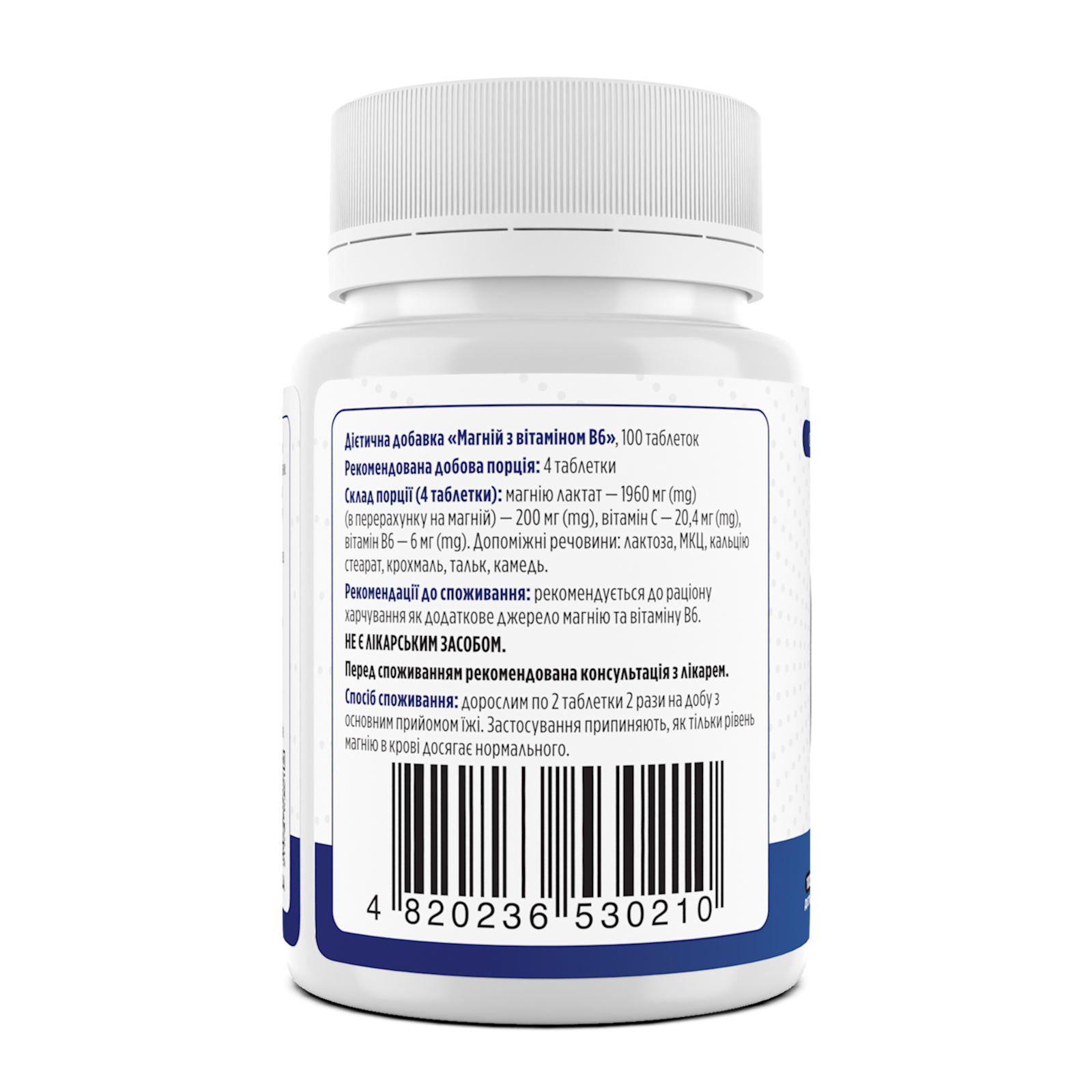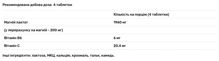 Склад порції: магнію лактат — 1960 мг (mg) (в перерахунку на магній) — 200 мг (mg), вітамін С — 20,4 мг (mg), вітамін В6 — 6 мг (mg). Допоміжні речовини: лактоза, МКЦ, кальцію стеарат, крохмаль, тальк, камедь.