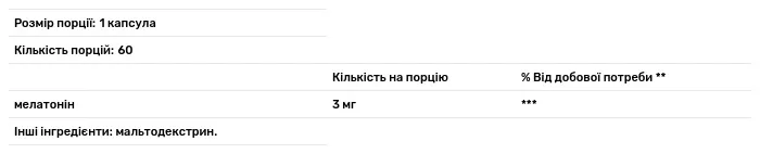 Склад порції: мелатонін – 3 мг (mg). Допоміжні речовини: мальтодекстрин.