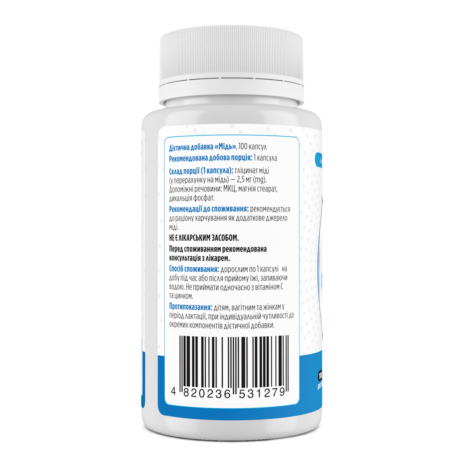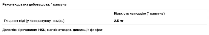 Склад порції: гліцинат міді (у перерахунку на мідь) – 2,5 мг (mg). Допоміжні речовини: МКЦ, магнія стеарат, дикальція фосфат.