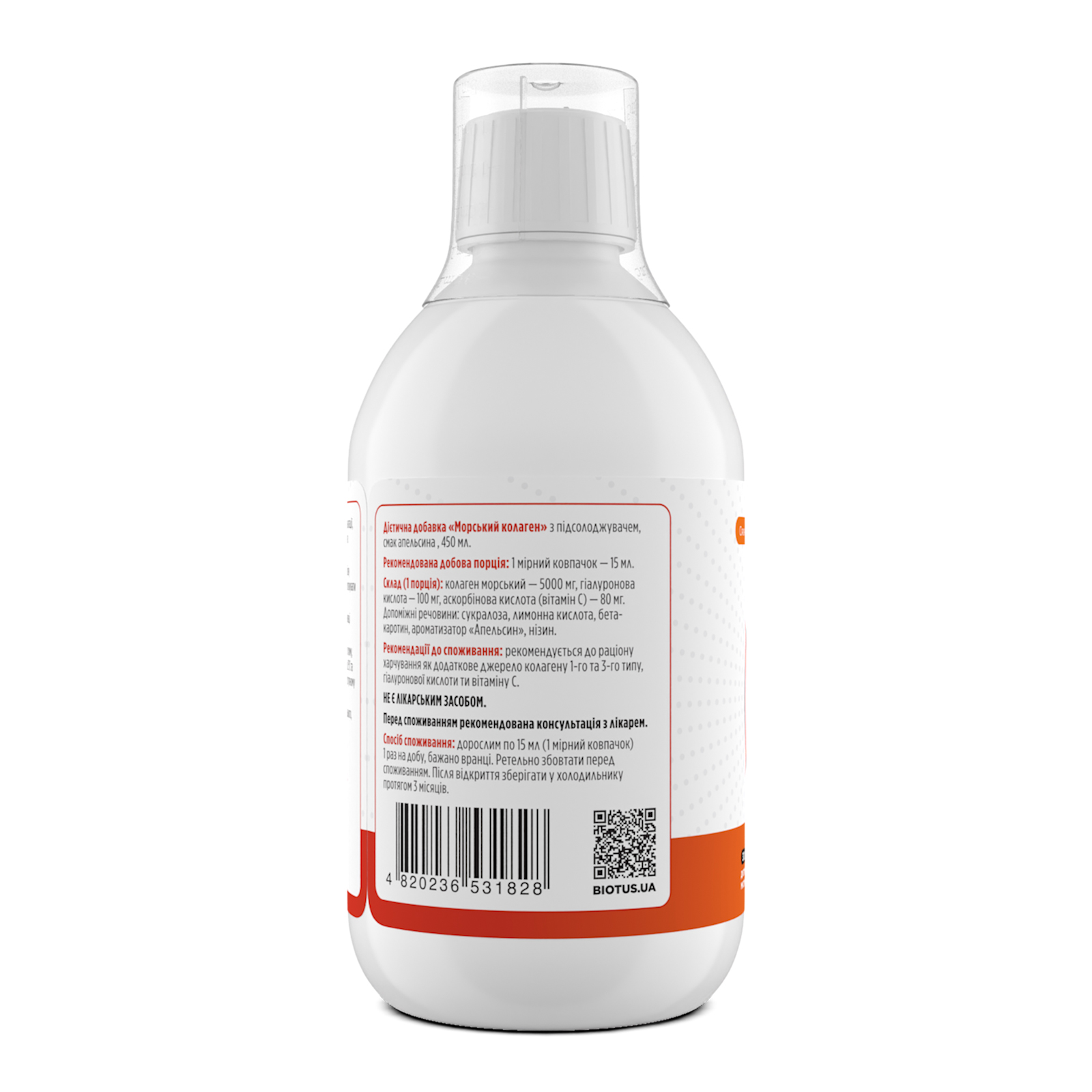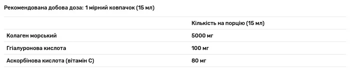 Склад порції: колаген морський – 5000 мг (mg), гіалуронова кислота – 100 мг (mg), аскорбінова кислота (вітамін С) – 80 мг (mg). Допоміжні речовини: сукралоза, лимонна кислота, бета-каротин, ароматизатор апельсин, нізин.