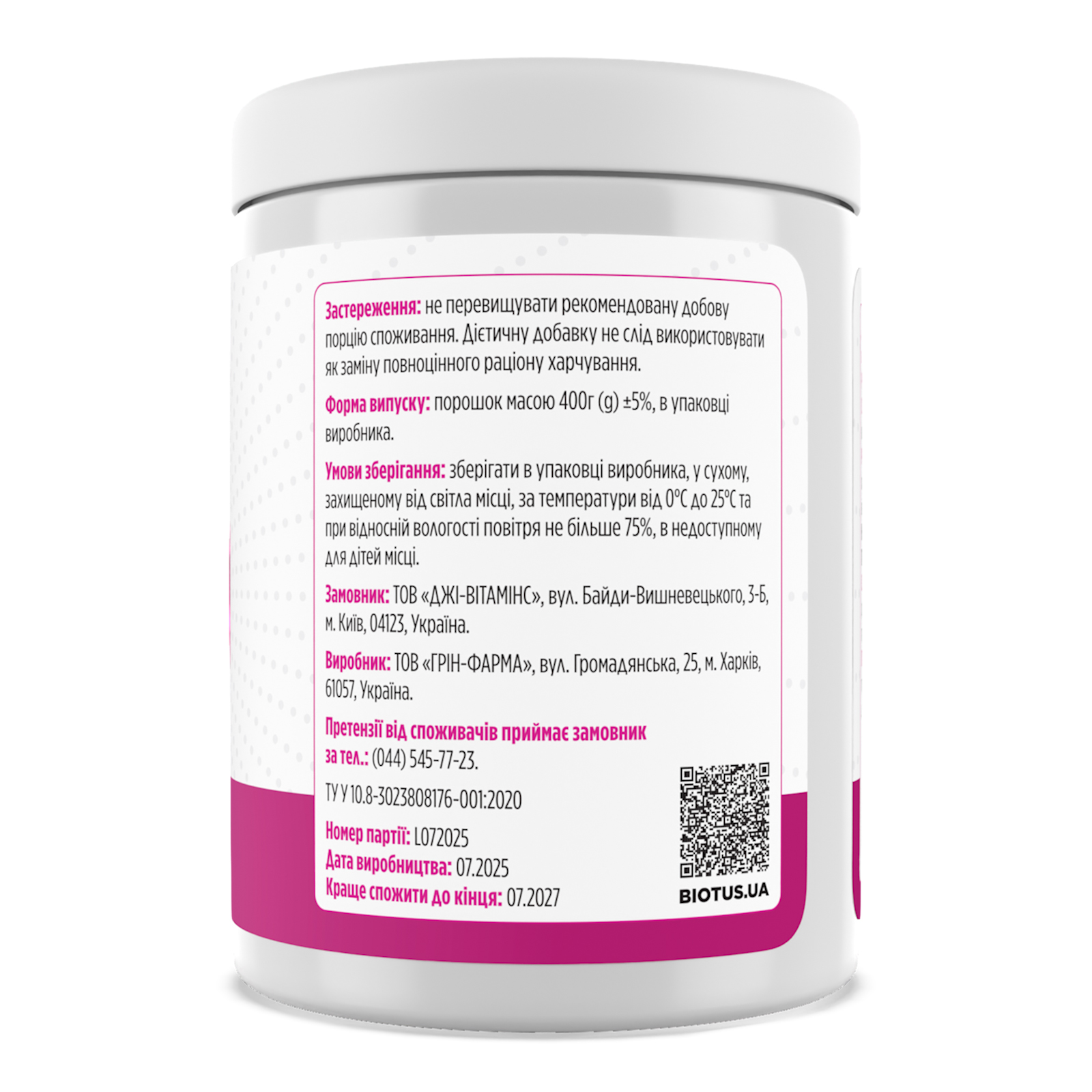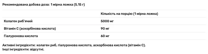 Склад порції: колаген риб’ячий – 5000 мг (mg), аскорбінова кислота (вітамін С) – 90 мг (mg), гіалуронова кислота – 60 мг (mg).