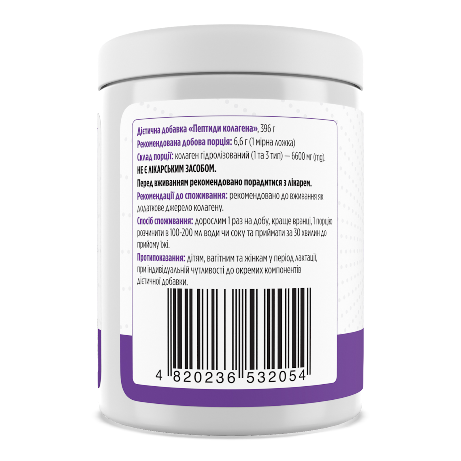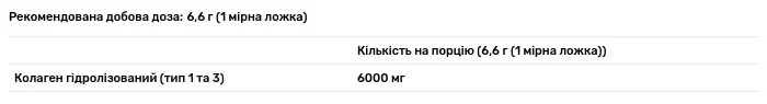 Склад порції: колаген гідролізований (1 та 3 тип) – 6600 мг (mg).