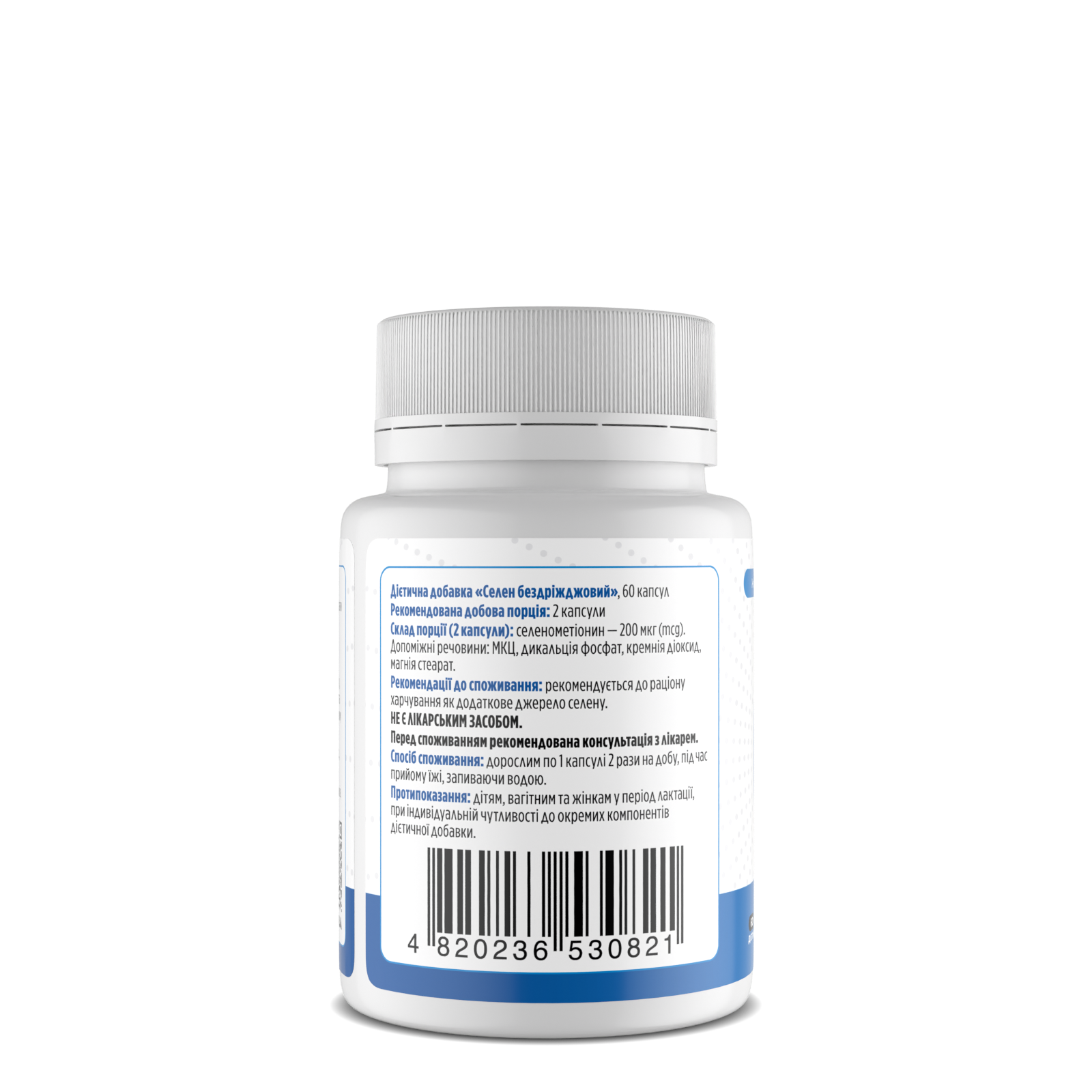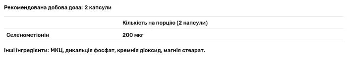 Склад порції: селенометіонин — 200 мкг (mcg). Допоміжні речовини: МКЦ, дикальція фосфат, кремнія діоксид, магнія стеарат.