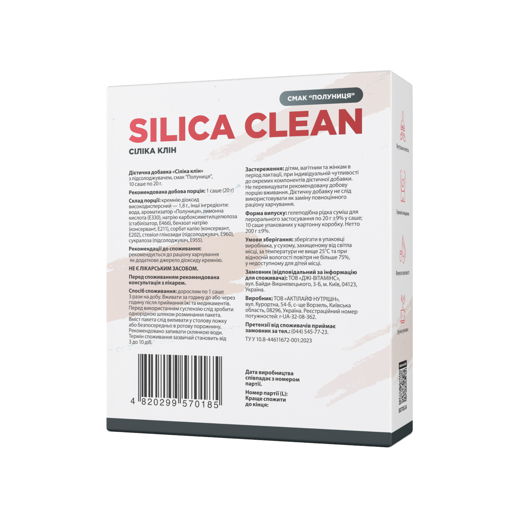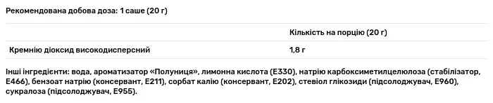 Склад порції: кремнію діоксид високодисперсний – 1,8 г., інші інгредієнти: вода, ароматизатор «Полуниця», лимонна кислота (E330), натрію карбоксиметилцелюлоза (стабілізатор, E466), бензоат натрію (консервант, E211), сорбат калію (консервант, E202), стевіол глікозиди (підсолоджувач, E960), сукралоза (підсолоджувач, E955).
