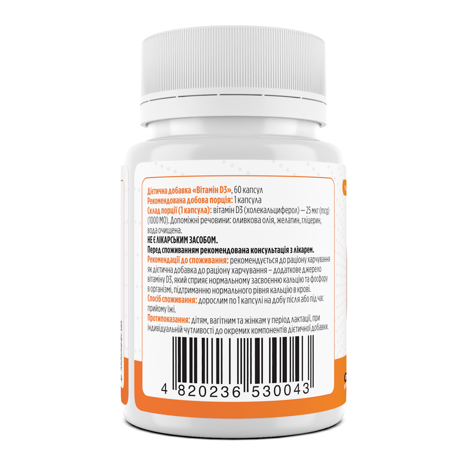 Склад порції: вітамін D3 (холекальциферол) — 25 мкг (mcg) (1000 МО). Допоміжні речовини: оливкова олія, желатин, гліцерин, вода очищена.