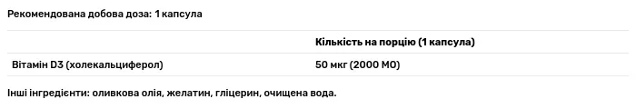 Склад порції: вітамін D3 (холекальциферол) — 50 мкг (mcg) / 2000 МО (IU). Допоміжні речовини: оливкова олія, желатин, гліцерин, вода очищена.