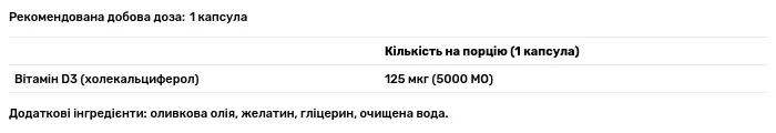 Склад порції: вітамін D3 (холекальциферол) — 125 мкг (mcg) / 5000 МО (IU). Допоміжні речовини: оливкова олія, желатин, гліцерин, вода очищена.