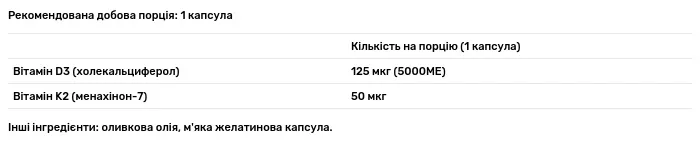 Склад порції: вітамін D3 (холекальциферол) — 125 мкг (mcg) / 5000 МО (IU), вітамін K2 (у формі менахінону-7) – 50 мкг (mcg). Допоміжні речовини: оливкова олія, м’яка желатинова капсула.
