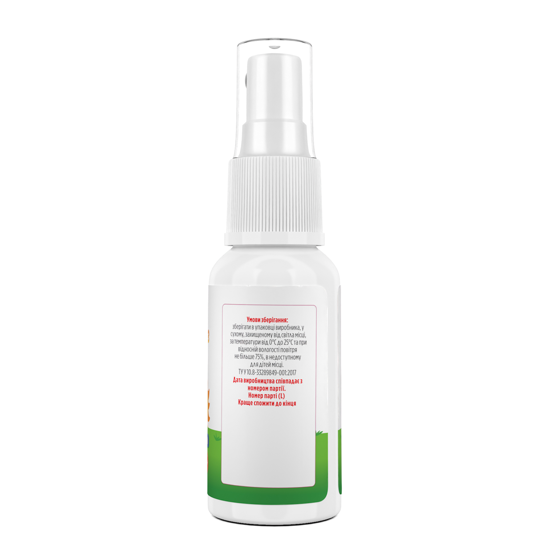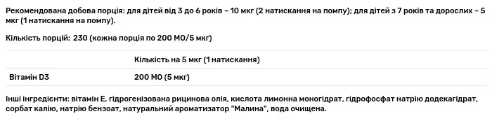 Склад порції: вітамін D3 (холекальциферол) – 5 мкг (mcg)/(200 МО), вітамін Е, гідрогенізована рицинова олія, кислота лимонна моногідрат, натрію гідрофосфат додекагідрат, сорбат калію, натрію бензоат, натуральний ароматизатор “Малина”, вода очищена.