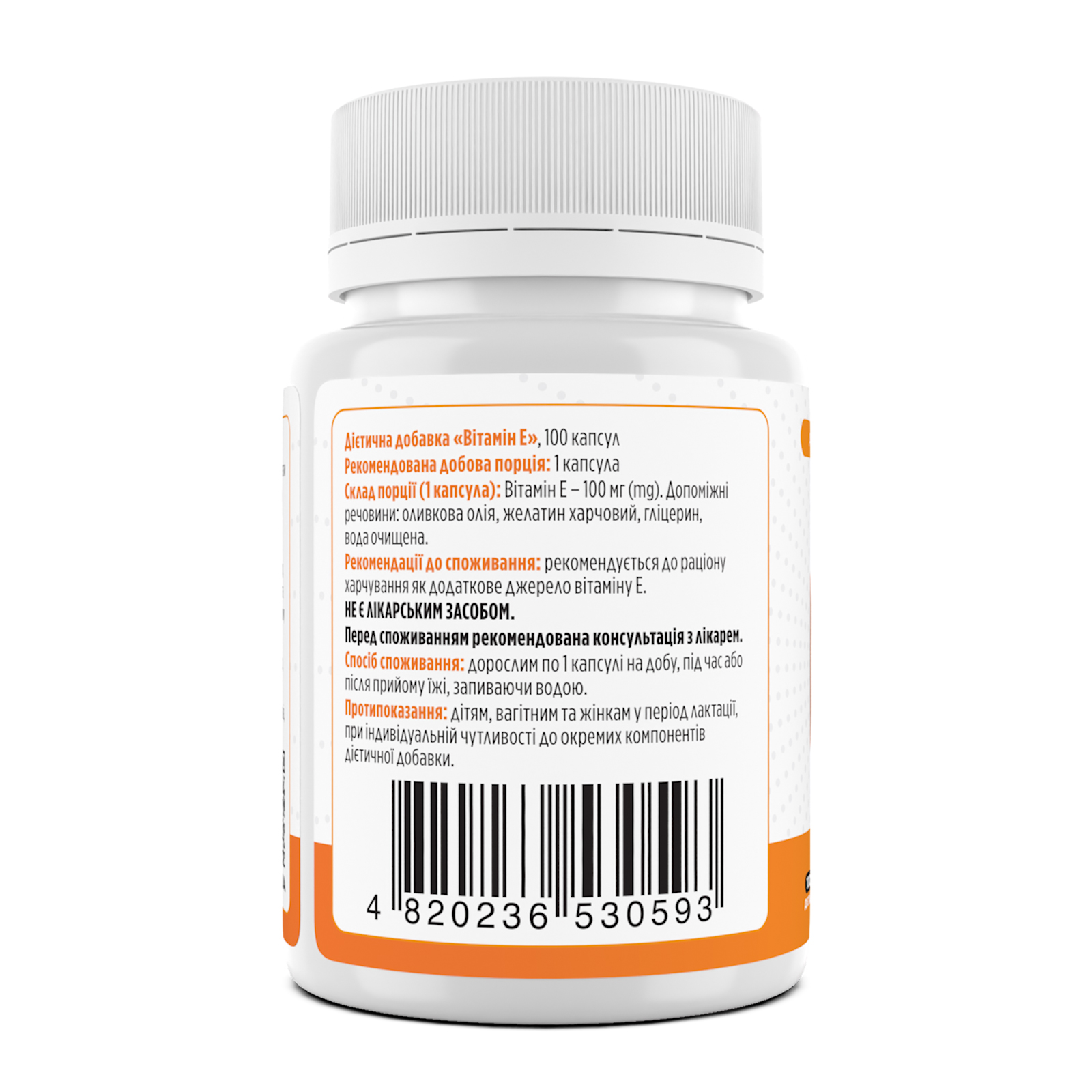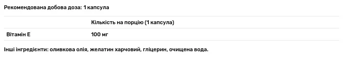 Склад порції: вітамін Е – 100 мг (mg). Допоміжні речовини: оливкова олія, желатин харчовий, гліцерин, вода очищена.