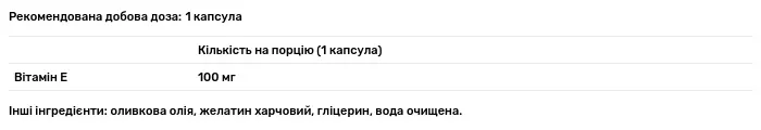 Склад порції: вітамін Е – 100 мг (mg). Допоміжні речовини: оливкова олія, желатин харчовий, гліцерин, вода очищена.