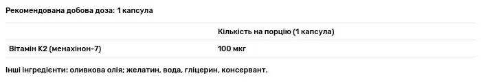 Склад порції: вітамін К2 (у формі менахінону-7) – 100,0 мкг (µg); Склад: оливкова олія; желатин, вода, гліцерин, консервант, менахінон-7.